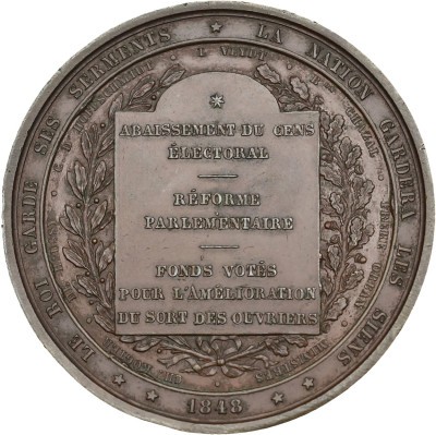 Description revers : Dans une couronne de chêne et de laurier, table inscrite ABAISSEMENT DU CENS/ ÉLECTORAL/ RÉFORME/ PARLEMENTAIRE/ FONDS VOTÉS/ POUR L’AMÉLIORATION/ DU SORT DES OUVRIERS , tout autour les noms de membres du gouvernement
