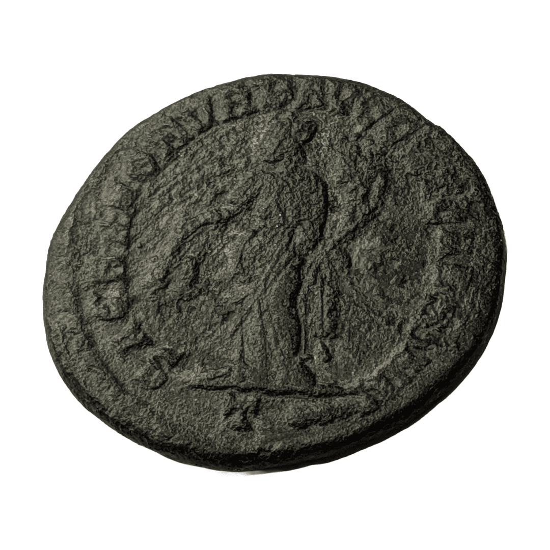 Traduction revers : « Sacra Moneta Urbis Augustorum et Caesarum Nostrorum » (La Monnaie sacrée de la Ville de nos Augustes et de nos Césars).