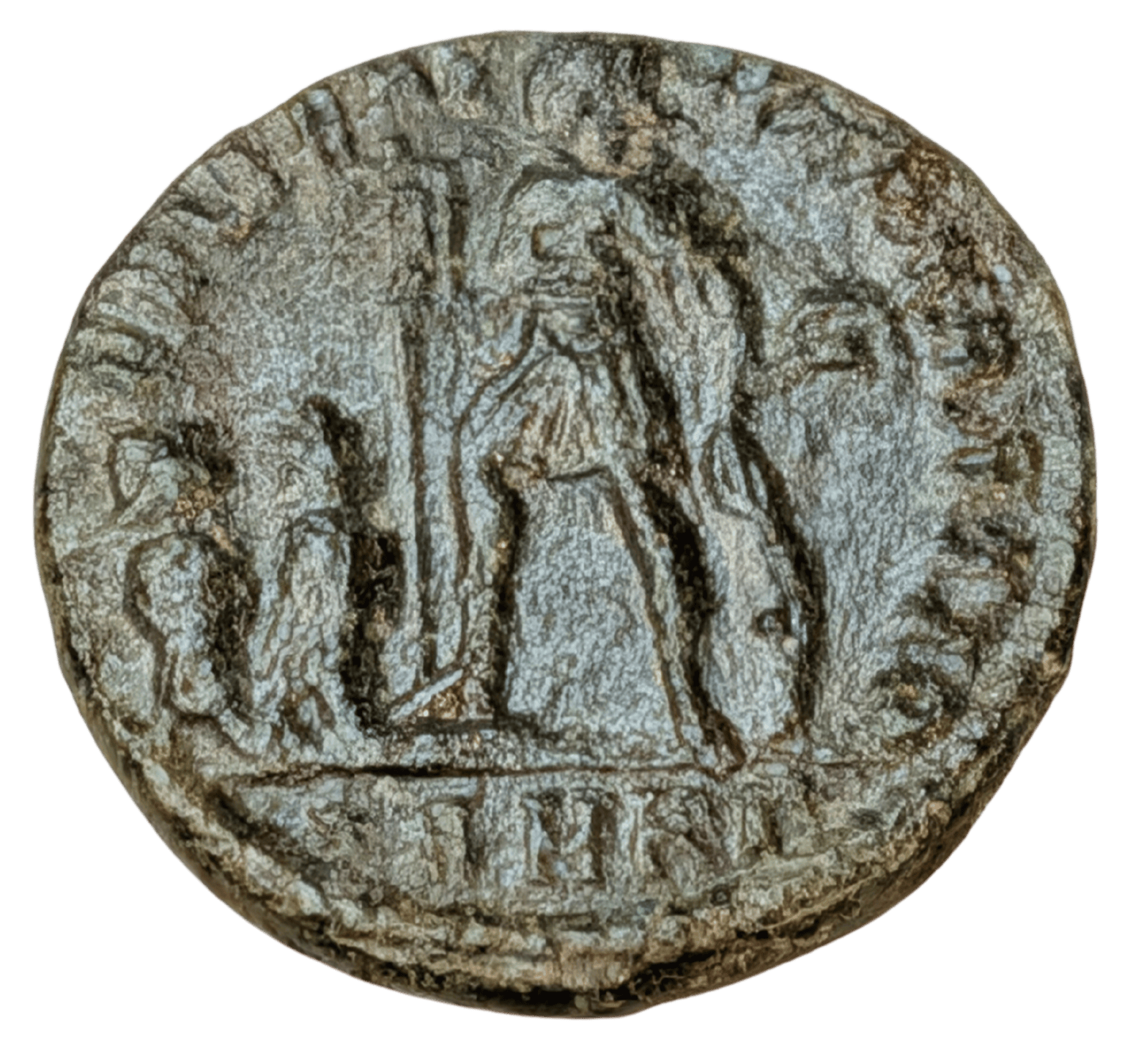 Description du revers : L’empereur, tête nue et en tenue militaire, debout tourné à gauche, brandit de la main droite un labarum chrismé et tient un bouclier de la main gauche. À ses pieds se trouvent deux captifs agenouillés, face à face, orientés vers la gauche.