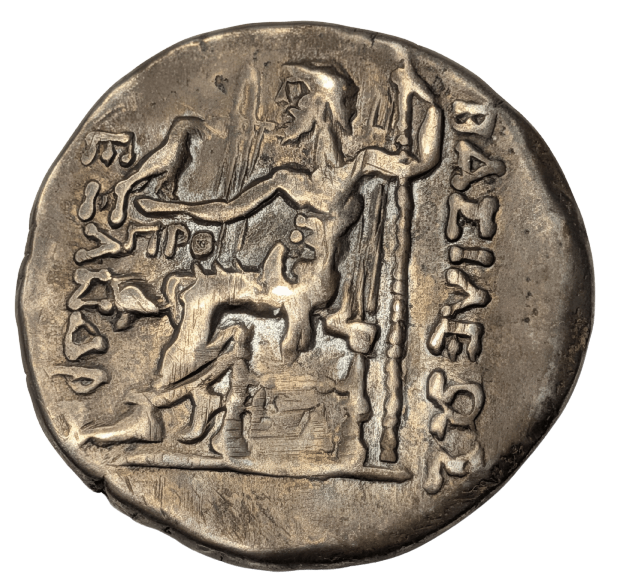 Description revers : Zeus assis vers la gauche sur un siège ornementé, tenant un aigle dans la main droite et un long sceptre dans la gauche ; dans le champ gauche, un casque attique à cimier orienté vers la droite.
